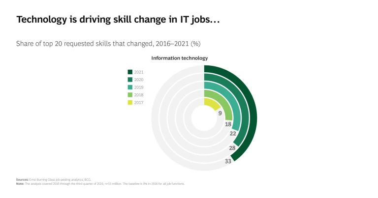Over just five years, skill change has been rapid and wide ranging. In some occupations, it has been overwhelming. The consequent impact on organization leaders, HR teams, educators, public-sector agents, and individuals is profound. There’s a need to seek talent with new skills, to reskill and upskill employees, and to train and develop those in search of jobs. And all of this must happen while the skill profiles of many jobs continue to morph—it’s a moving target.