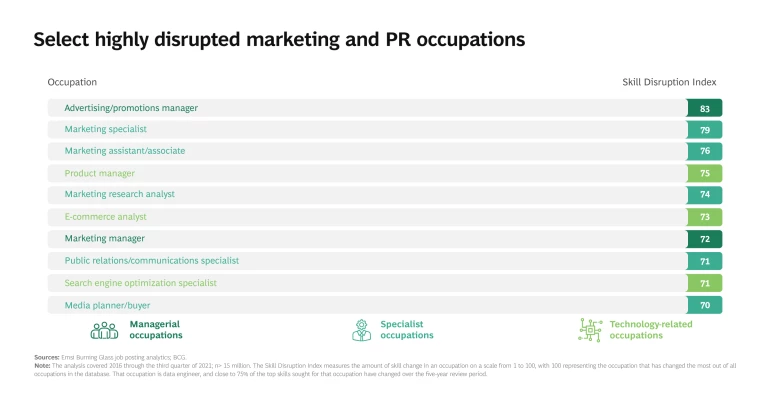 A closer look at skill disruption in one job family—marketing and public relations—shows the impact of skill disruption. The marketing and PR job family is a useful example: companies across industries include this department, so it’s widely relevant.