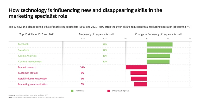 Drilling down further into one specific occupation—marketing specialist—is a good proxy for skill disruption in this job family overall as well as the way technology is driving skill change. “Marketing specialist” is a common role (15% of postings for marketing jobs are for marketing specialists) that exists in multiple companies and industries, and requested skills changed significantly over the past five years. Thus, a deeper look at the skills requested of a marketing specialist approximates the skill changes across the entirety of the job family. See the slideshow below.