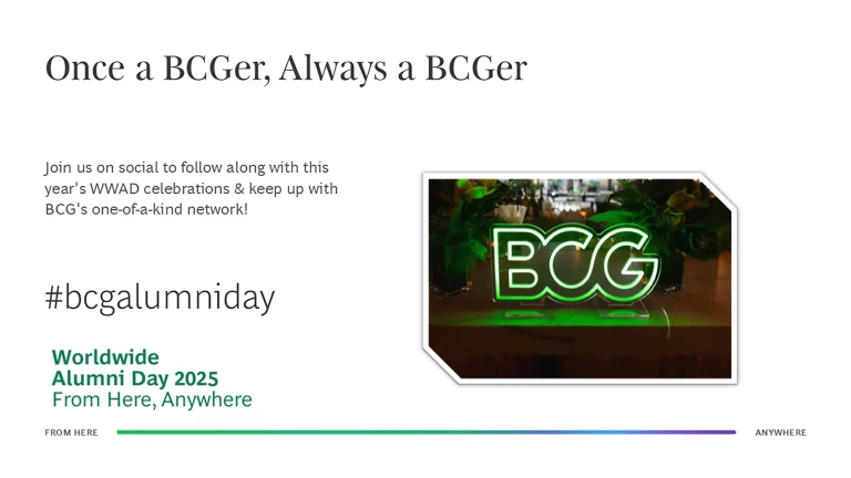 The world never stops changing, but one thing that we can count on is that once you’re a BCGer, you’re always a BCGer. BCGers are resilient, creative, passionate leaders, driven by a shared aspiration to be positive change agents in the world. Our paths take us to many places – to new geographies, new industries, new companies, and new challenges – but we stay connected to our one-of-a-kind network by a shared thread of passion and integrity.
