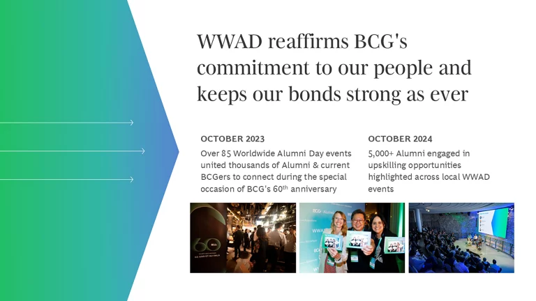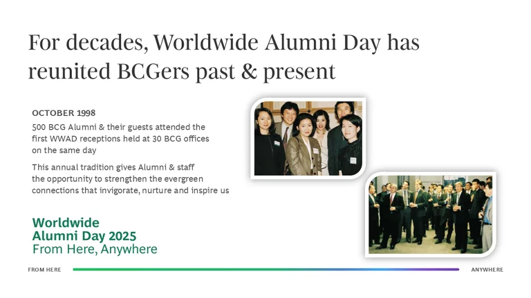 Take a look at how past WWADs have reunited old friends and new, kept alumni informed of the latest from BCG, and created memories that last a lifetime while celebrating the evergreen connections that make this network so special.