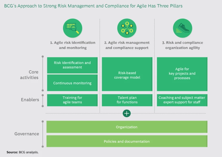 Agile is not inherently more risky or prone to missteps such as this one, but adopting an agile approach also means that companies need to adapt risk management to the new ways of working so that risk and compliance keep pace with agile teams as they iterate through product delivery. Companies can manage financial, operational, and compliance risks in a robust manner while business teams reorient their focus toward better serving customer and business needs. In our experience, firms can secure the many benefits of agile while maintaining effective risk management and compliance processes that, for regulated industries, also address regulatory expectations. (See the exhibit.)