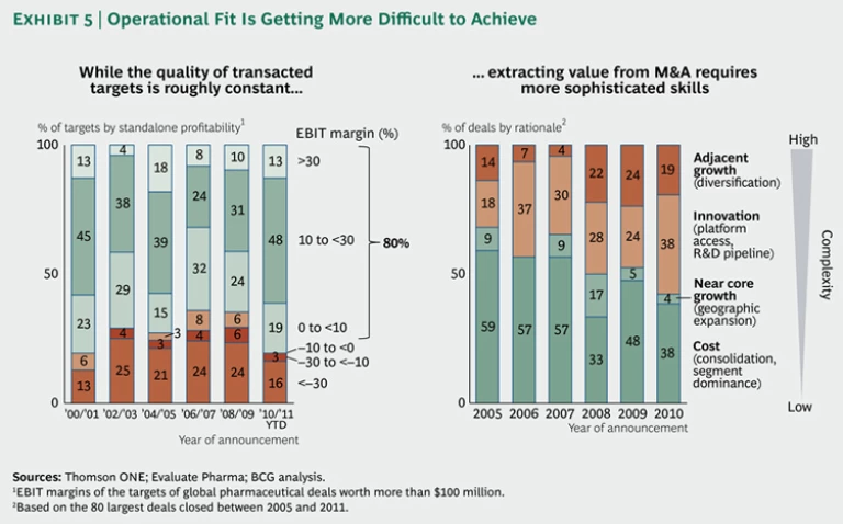 Pharma executives are right, though, that fit and the creation of operational value from deals are increasingly difficult. As the focus of M&A shifts from simply consolidating and taking out costs to expanding R&D platforms and fostering adjacent growth, integration and synergies become much more difficult to achieve. (See the right-hand graph in Exhibit 5.)