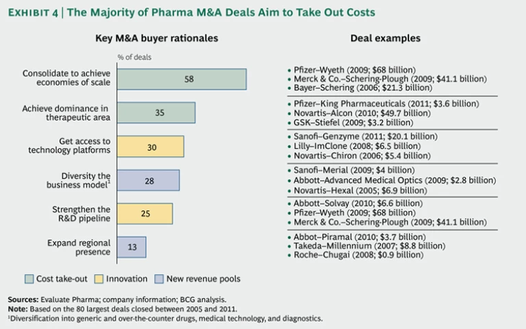 Maintaining Margins. In most large deals (58 percent), the major objective was to slash costs through pure consolidation. By combining sales forces, manufacturing, and overhead with those of another company, originators strive to eliminate redundant costs—and to spread R&D investment and the associated risks over a larger revenue base. For example, Pfizer’s 2009 acquisition of Wyeth, which followed its 2003 takeover of Pharmacia, enabled it to build greater scale and secure its position as the world’s largest pharmaceutical company.