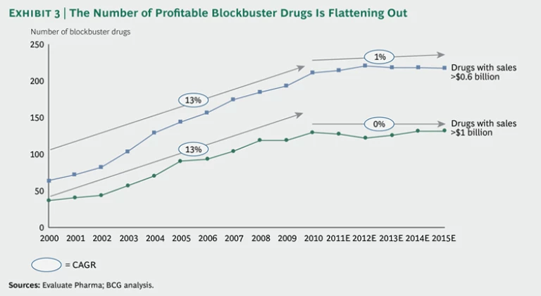 The problem becomes especially evident when we look at the number of hugely profitable blockbuster drugs in the market. (See Exhibit 3.) While this number rose by an average of 13 percent each year from 2000 through 2010, it is expected to remain flat over the next five years.