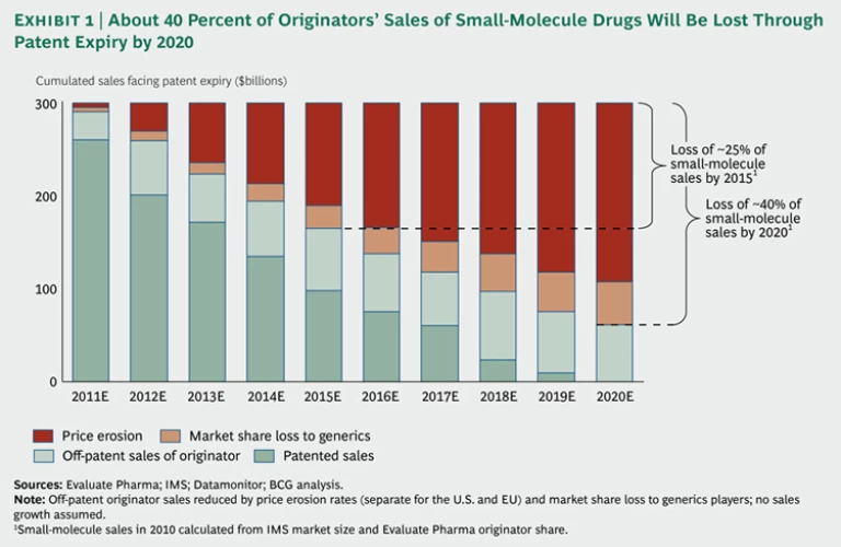 Falling Off the Patent Cliff. Over the next five to ten years, many of today's top-selling drugs will lose their patent protection, especially the small-molecule drugs that dominate the product portfolios of major originators. For many of these companies, revenues in the near future will fall steeply as prices plunge and cheaper generic versions grab market share. We estimate that originators’ sales from currently marketed small-molecule drugs will drop by about 40 percent by 2020 due to patent expirations, with almost two-thirds of this loss occurring in the next five years. (See Exhibit 1.) Not all originators will be hit equally. Pfizer, for example, with the expiration of just one patent—for the cholesterol-lowering drug Lipitor in November 2011—faces a potential loss of up to $11 billion in revenue, or 15 percent of its sales. As a result, the company is expected to lose its number-one market position in terms of sales to Sanofi. Because of the patent cliff, many pharmaceutical companies face enormous pressure to slash their large fixed costs or to refill their product pipelines.