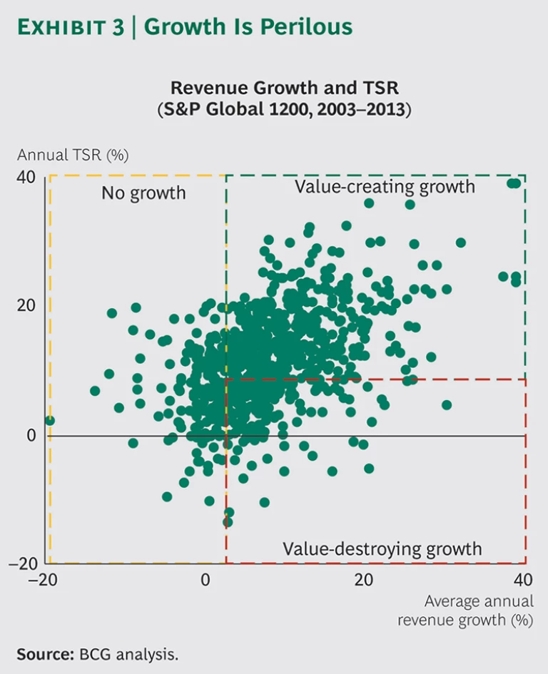 But not all growth is good growth—and the path is perilous. Just one-third of the full S&P Global 1200 achieved value-creating growth between 2003 and 2013. Another third failed to grow at all. And the final third grew, but destroyed value in the attempt. (See Exhibit 3.)