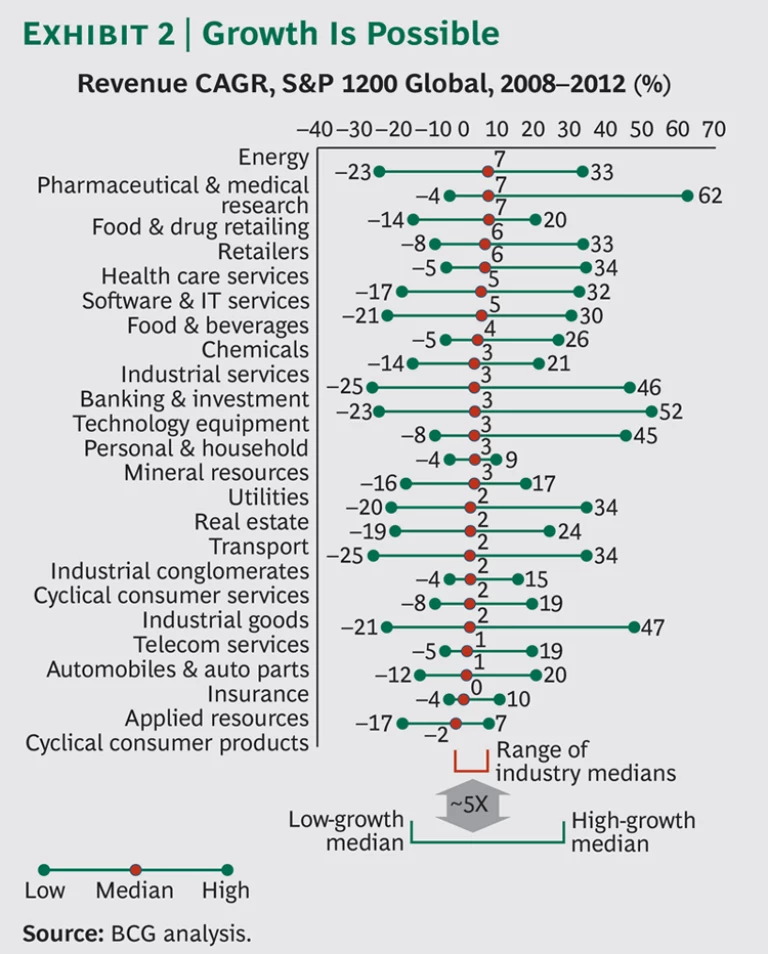 Many executives, sobered by growth headwinds or past failures, consider growth a long shot. However, our analysis shows that growth is possible even in the most challenging sectors. On average, there is five times greater variability in growth rates within an industry than there is across industries. It is not the cards you are dealt; it is how you play them. (See Exhibit 2.)