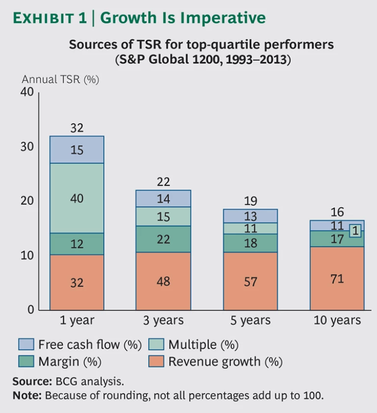 Growth is imperative because it strengthens companies and drives the capital gains they deliver to shareholders. It builds advantages of scale and scope, attracts talent, delivers funds for reinvestment, and forces competitor investment. Studying the top-quartile value creators in the S&P Global 1200 from 1993 through 2013 is revealing. Even in the short term, revenue growth accounted for 32 percent of one-year total shareholder return—more than twice the contribution of increased free cash flow and nearly triple that of margin expansion. And in the long term, revenue growth was nearly all that mattered, explaining 71 percent of ten-year TSR. (See Exhibit 1.)