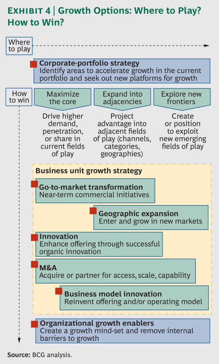 The what of growth can be summarized as a cohesive set of decisions about where to play and how to win. Deciding where to play means allocating bets and resources across the core, adjacencies, and new frontiers. Core bets involve finding headroom in market share or customer demand within the current footprint of the business. Adjacency bets extend current advantage into nearby offerings, channels, or geographies. New-frontier bets are longer throws that more dramatically reimagine offerings or business models—or find new uses for old assets. These choices determine the field of play but once made, require additional choices about where a business will invest to win on the field. We suggest seven how-to-win levers that can be differentially employed for success.