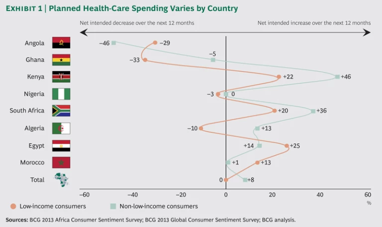 When it comes to health care, low-income consumers in Africa spend roughly one-sixth of what they spend on food and beverages, half of what they spend on rent and transportation, and about two-thirds of what they spend on phone/Internet and beauty care. High-income consumers spend about three times more on health care per month than low-income Africans.
