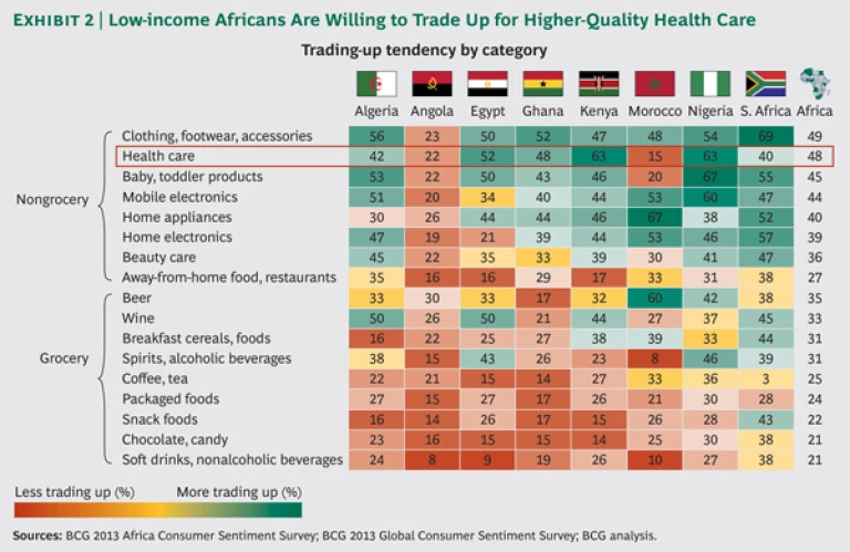 Despite these variations, most of the low-income consumers surveyed said they would spend more for higher-quality health-care products and services—a product category that ranked second among 17 categories in terms of the willingness to trade up, after clothing, footwear, and accessories. (See Exhibit 2.) The inclination to trade up differs slightly by country and is more muted in Angola and Morocco than elsewhere.