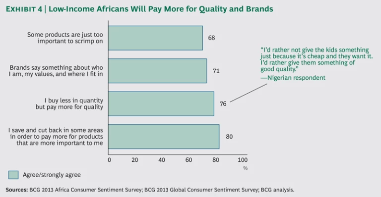 Although price matters to many Africans, particularly those living on limited budgets, it is no longer the major obstacle to purchasing in certain countries. Our research showed that low-income consumers aren’t looking for the cheapest product. Sixty-eight percent said that some products were too important to scrimp on, and 76 percent said they value quality over quantity—and would pay more for it. (See Exhibit 4.) African consumers research the products they buy, seeking quality, performance, and good value. But they’ll also forgo unnecessary features in exchange for a lower price. African consumers might not need or want a product with all the bells and whistles available to buyers in developed markets.