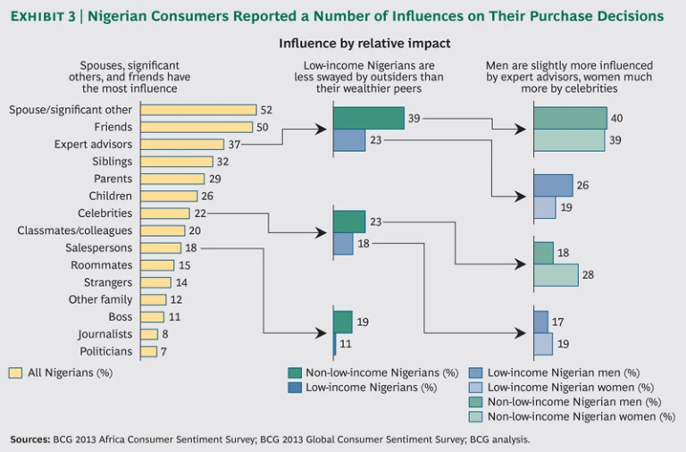Consumer segments within countries can also differ. For example, the typical Nigerian consumer relies on spouses, significant others, and friends for purchase advice. (See Exhibit 3.) But a deeper analysis of income, age, and gender differences shows that experts and celebrities play a meaningful role as well—especially among higher-income consumers. Among wealthier male Nigerians, 40 percent said that they found experts helpful, even ranking them ahead of their parents and siblings in terms of influence. Twenty-eight percent of wealthier women said they were influenced by celebrities, compared with 19 percent of low-income women. Similarly, lower-income Kenyan men are relatively more influenced by radio, while lower-income women are more influenced by promotions at the point of sale, and both groups are highly influenced by contests. By contrast, newspapers are most influential among wealthier Kenyans.