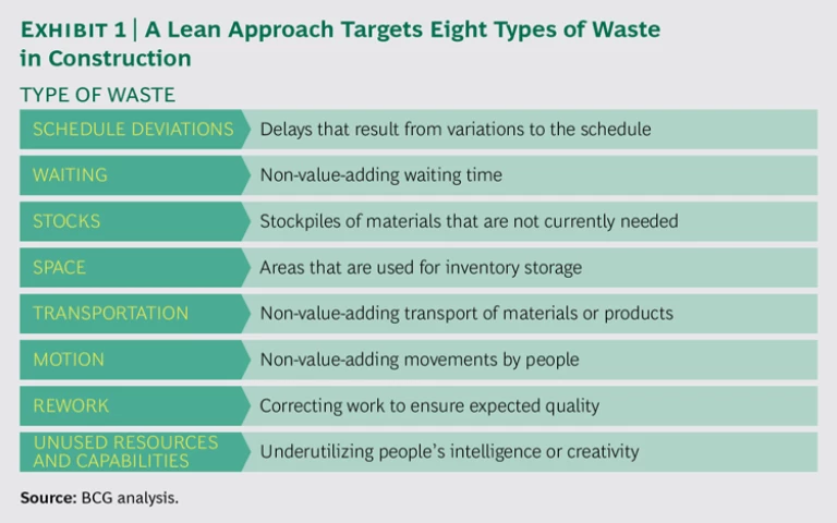 A lean approach reduces complexity and uncertainty by eliminating waste and non-value-adding activities throughout an entire process or value chain. The distinctive characteristics of construction projects give rise to particular types of waste and non-value-adding activities. (See Exhibit 1.) By revealing and removing them, a lean approach makes processes more stable, predictable, and efficient—all of which increase productivity and help general contractors achieve targets for profitability. The goal is to focus the organization on activities that create the greatest value—whether the highest quality, the lowest cost, or the shortest lead time—for the customer.