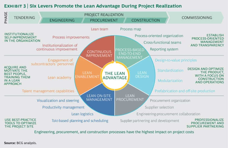 Given the high potential to capture value during the project realization phase, we focus on the six lean levers, each of which applies some or all of the four core lean principles and is intended to reduce complexity and uncertainty relating to products, processes, or people, or a combination of them. (See Exhibit 3.) Contractors should institutionalize the best practices described for each of these levers in a lean construction system that sets out both the organizational and technological requirements for executing a project. This system should then be used on a company-wide basis to guide the execution of future projects.