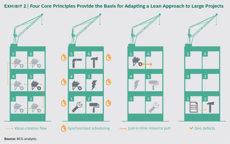 - Value-Creation Flow. To ensure that activities are focused on value creation, all resources, materials, and information need to be interlinked in a single flow through the project. The goal is to eliminate downtime and ensure that value-adding activities occur continually, thereby shortening the project’s overall timeline. To introduce this principle for a recent construction project, The Boston Consulting Group divided the building into several sections and worked with the contractor to design a value-creation flow on the basis of the movement of subcontractors and craftspeople through each section.