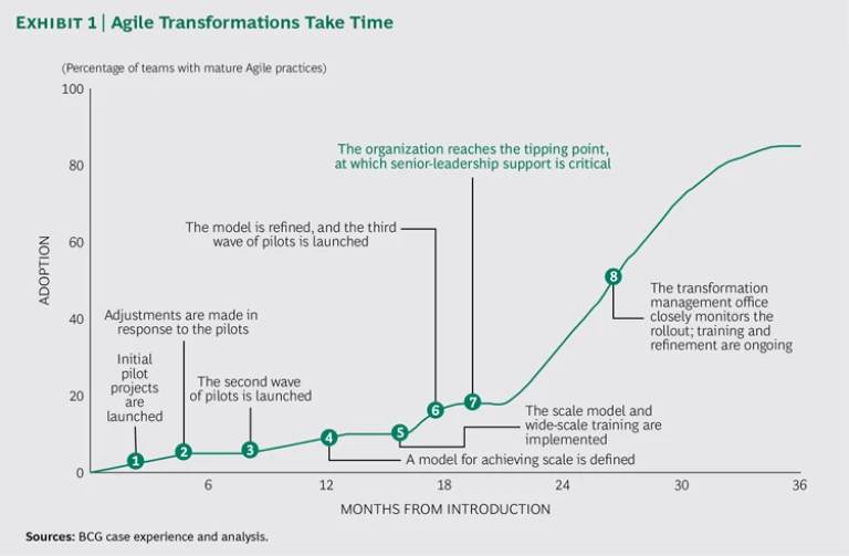 Transformative change requires support from the top. Senior leaders need to be actively involved in fundamental decisions about the business purpose of going Agile and the cultural barriers and root causes that might stand in the way of success. Without this commitment, legacy approaches to, for example, capital allocation, HR processes, and portfolio management will doom Agile. That’s why business—not just tech—leaders must be accountable.