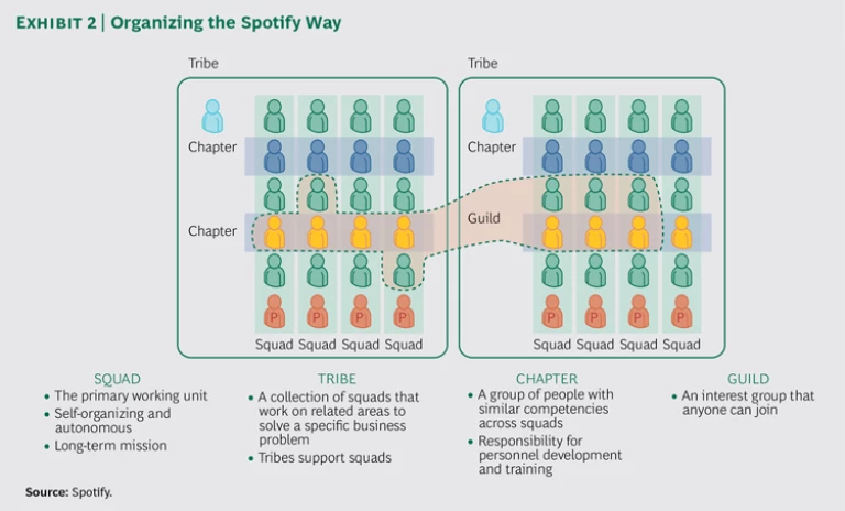 Several successful approaches exist for scaling up Agile within organizations. At one extreme, the music-streaming service Spotify has fundamentally changed its organization structure. The company’s product-delivery organization is made up of squads, tribes, chapters, and guilds. The primary unit is the squad, a multidisciplinary team that works toward a shared purpose and is run by a product owner. Tribes are groups of squads that work on related areas. Chapters are groups of people with similar expertise across squads, and they form the line organization. Guilds are interest groups that anyone can join. (See Exhibit 2.) Other companies have simply overlaid cross-functional teams above existing hierarchy.