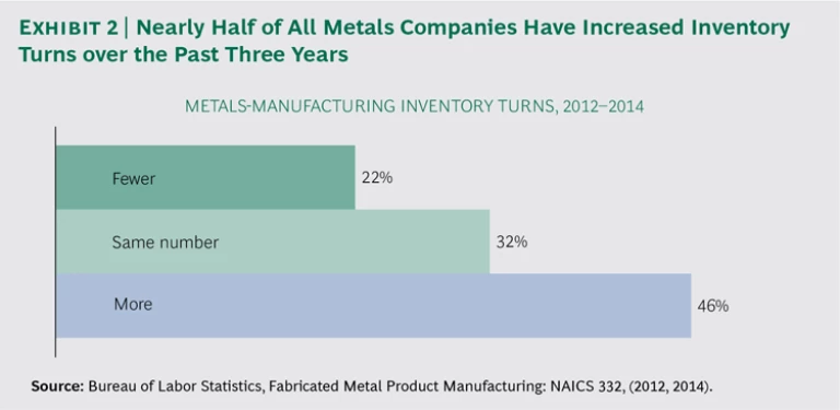 Using strategies such as these, a number of metals-manufacturing companies have improved their inventory turnover significantly in recent years. (See Exhibit 2.) When management is supportive and deploys the appropriate tools, it is not unusual for companies to reduce total inventory by 20% or more without disrupting operations in any way. The benefits can be multiplicative: for every dollar a company frees up by reducing inventory, $5 to $8 can be gained for investment as a result of the company’s higher debt capacity.