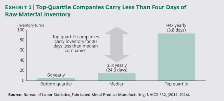 Inventory management varies widely among metals companies. Companies in the top quartile of inventory turnover tend to have no more than three to four days of raw materials on hand. (See Exhibit 1.) Other companies hold onto aging, unsold finished goods longer than they should, believing that one day they might get full value for those products. And some metals companies hold more than a month’s supply of commodity raw materials as “safety” stock to cover unexpected shortfalls.