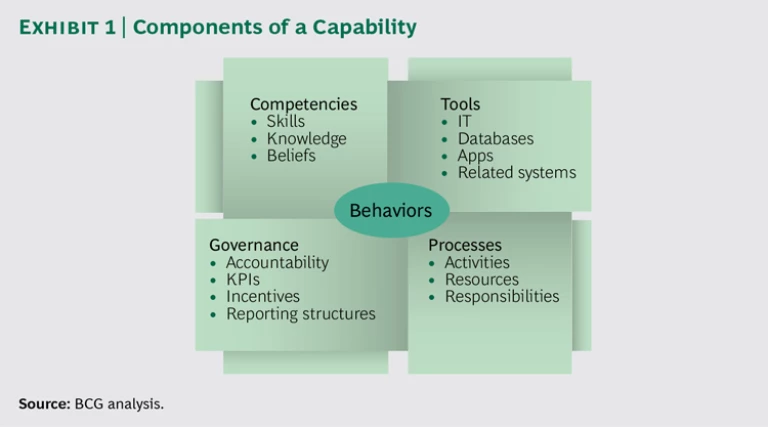 To address these challenges, companies need to start with a comprehensive definition. As stated above, a capability is a deeply ingrained ability to do something well in a way that improves business performance. At the core are behaviors: the activities, interactions, and decisions made by a set of individuals in a company who exemplify that capability.