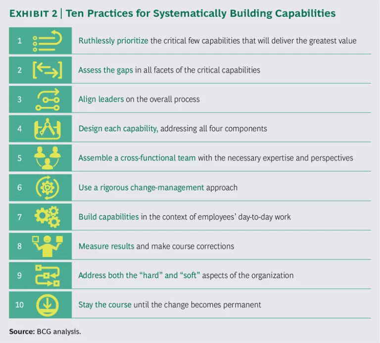 With a comprehensive definition in place, companies can turn their attention to identifying and developing the capabilities they will need to generate lasting change through transformation. On the basis of our experience, we have identified ten key practices for building capabilities. (See Exhibit 2.)