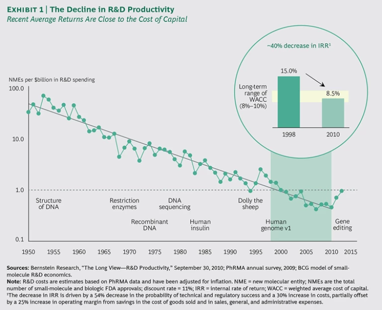 Since the 1950s, R&D productivity has been declining relentlessly. Roughly in keeping with Eroom’s law (Moore’s law in reverse), the number of drug approvals per inflation-adjusted dollar invested in R&D has halved every nine years.