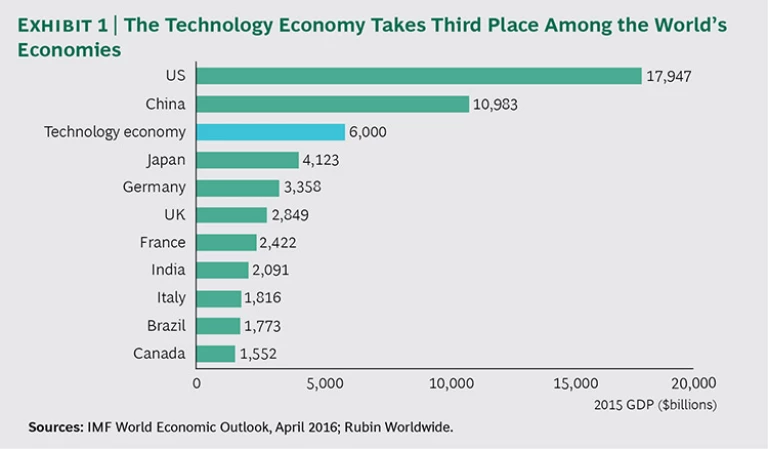 Furthermore, technology permeates companies. Worldwide corporate IT spending—an important barometer of the technology economy that focuses on corporate spending for hardware, software, data centers, networks, and staff, whether “internal” IT or outsourced services—is nearly $6 trillion per year. This amount is what it would cost to give a $500 smartphone and $350 tablet to each of the 7.1 billion people on Earth. If the global technology economy were a country and that spending its GDP, it would rank between the economies of China and Japan and would be more than twice the size of the UK economy. (See Exhibit 1.) Corporate technology spending grew by a factor of almost 20 from 1980 through 2015, while global GDP barely tripled.