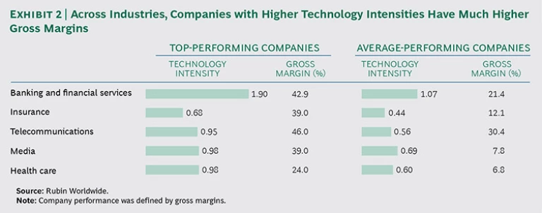 We have found that, across a range of industries, companies with high technology intensity have high gross margins. For instance, in the insurance sector, top-performing companies enjoy gross margins that are more than three times the margins of average performers and technology intensities that are more than 50% higher. In banking and financial services, companies with the highest gross margins have technology intensities and margins that are roughly double those of average performers. (See Exhibit 2.) This industry has seen extremely high levels of automation over the past five years—including technology systems that streamline processes, and advances in artificial intelligence that allow robots to answer clients’ questions and, eventually, to execute trades. Michael Rogers, the president of State Street, estimated in Bloomberg Markets that by 2020, automation will have replaced one in five of the company’s workers. A Citigroup report estimates that within a decade, 1.8 million employees in US and European banks could be out of jobs.