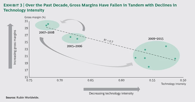 In fact, we see not just a connection between technology intensity and gross margins but also a strong correlation. That is, technology intensity and gross margins tend to rise and decline together. This effect was seen before and after the recent world economic crash. (See Exhibit 3.) In the run-up to the Great Recession that started in 2007, companies were investing more and more heavily in technology relative to revenues and operating expenses, and gross margins were rising. That trend accelerated through 2008 and until 2009, when companies belatedly realized the magnitude of what had happened and began to cut technology investment dramatically. After that, technology intensity dropped precipitously along with gross margins.