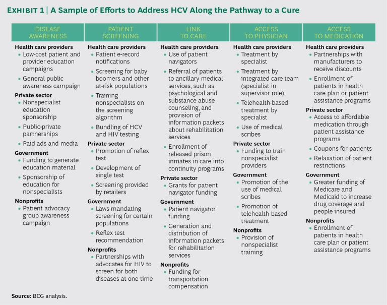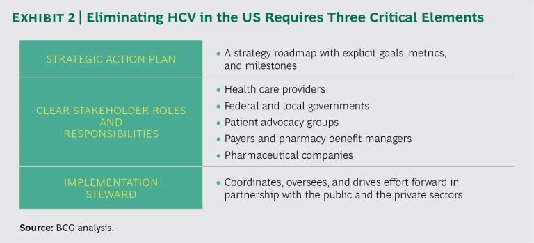 To find out, The Boston Consulting Group conducted a thorough analysis of HCV research and literature, interviewed leading experts, and evaluated existing treatment models. We identified seven critical actions that must be taken to eliminate HCV in the United States.