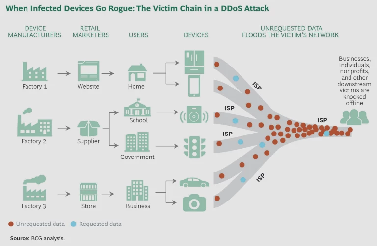 The real harm occurs farther down the chain. An ISP may see a flood of junk traffic clogging its network. Businesses, individuals, and entities relying on that ISP may find themselves knocked offline. (See the exhibit.) Typically, these end-of-the-chain actors bear the brunt of the damage. But they are also the actors in the worst position to do anything about it, because the key vulnerability that makes the damage possible lies far upstream, at the poorly secured IoT devices.