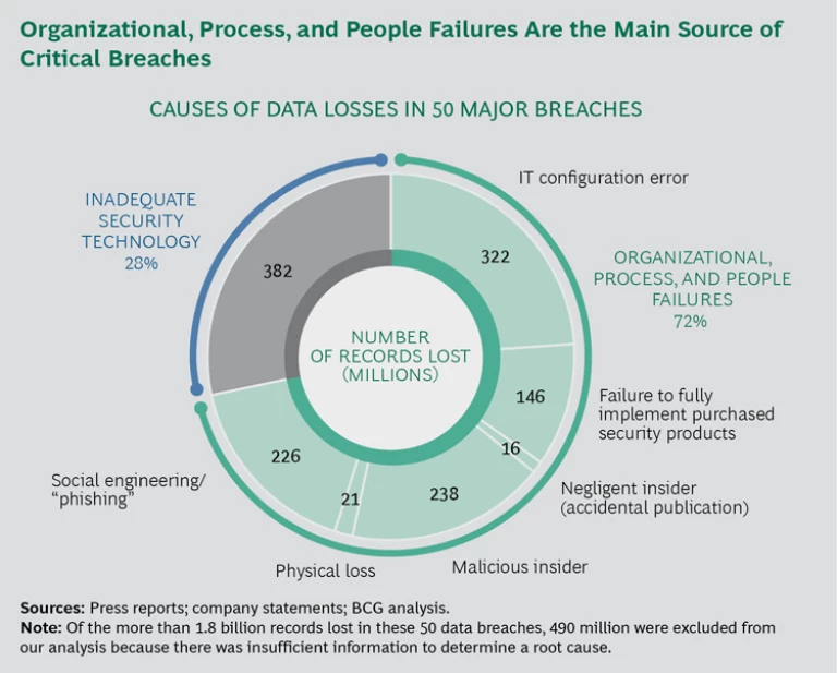 Cyberresilience cannot be left exclusively to the technology domain. As illustrated in the exhibit above—reprinted from “Building a Cyberresilient Organization,” BCG article, January 2017—recent BCG research indicates that more than 70% of breaches exploit nontechnical vulnerabilities. For example, an attack may trick users into disclosing their legitimate credentials. The lesson here is that cyberresilience in an organization must extend beyond the technical IT domain to the domains of people, culture, and processes. A company’s protective strategies and practices should apply to everything the company does—to every process on every level and across departments, units, and borders—in order to foster an appropriately security-conscious culture. Ultimate responsibility for cyberresilience rests squarely on the shoulders of boards and senior executives. It is up to them to push this culture change through the layers of their company.