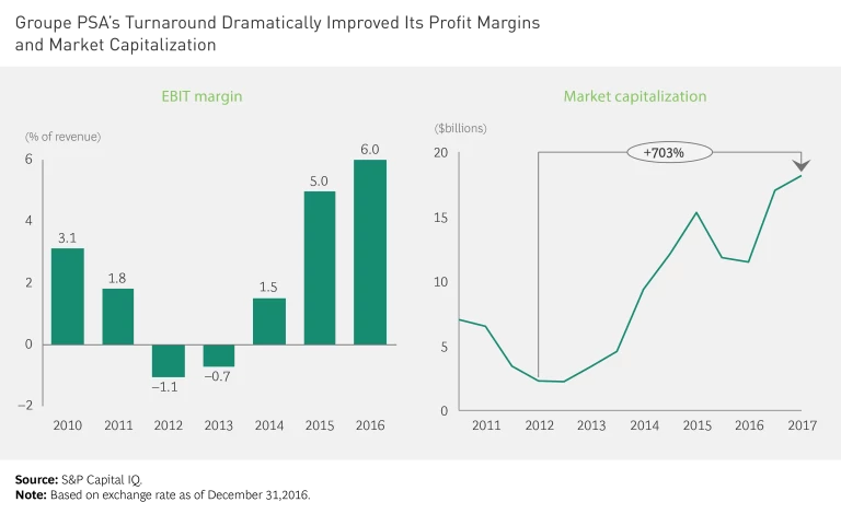 Groupe PSA, the parent company of Peugeot, Citroën, Opel, Vauxhall Motors, and DS Automobiles, was languishing after the financial crisis in a weak automotive market in Europe. Overall, car sales in the region plunged in 2012 and lagged into 2013 as well, yet Groupe PSA was heavily dependent on that market, which accounted for more than two-thirds of its sales. The company had internal challenges as well. It had too many models (23 in its Peugeot brand and 22 in Citroën), which weren’t differentiated enough and cannibalized demand from one another. Pricing was lower on average than other manufacturers’, yet labor costs were higher.