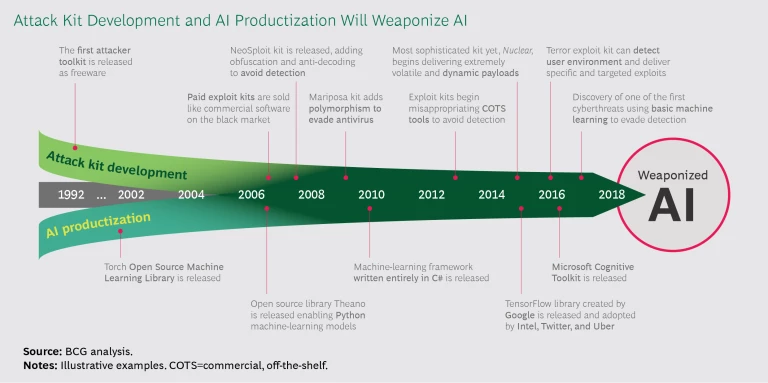 Companies are in a cybersecurity arms race. As cybersecurity firm Crowdstrike’s 2018 Global Threat Report makes clear, attackers have easy access to more tools as the lines between state actors and criminal gangs fade. Malware and identity theft kits are easy to find and inexpensive to buy on dark web exchanges. AI-enabled attack kits are on the way, and we can expect that they will be readily available at commodity prices in the next few years.