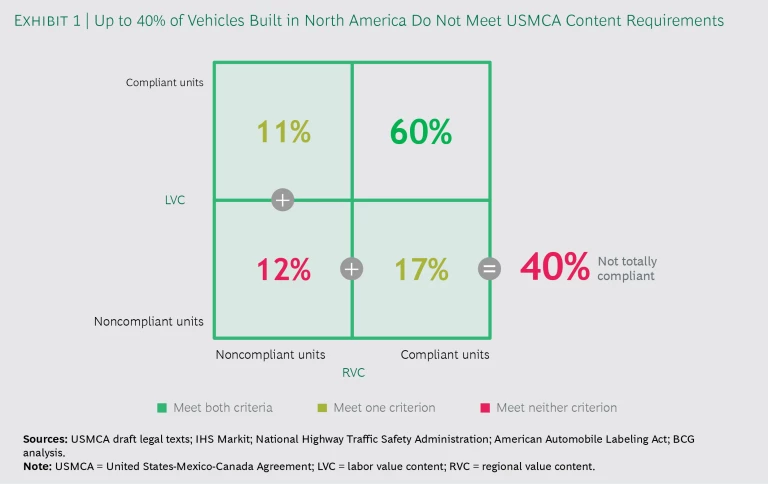 Given the confidential nature of the industry’s company cost data, it’s impossible to know precisely how much of current intra-USMCA trade does not comply with the new rules. But on the basis of publicly available data on parts content and the production locations of vehicle models, BCG estimates that, on an aggregate unit basis, up to 40% of passenger cars and light trucks currently being built and traded in North America may be noncompliant and, therefore, subject to tariffs from one or more of the three countries. (See Exhibit 1.)