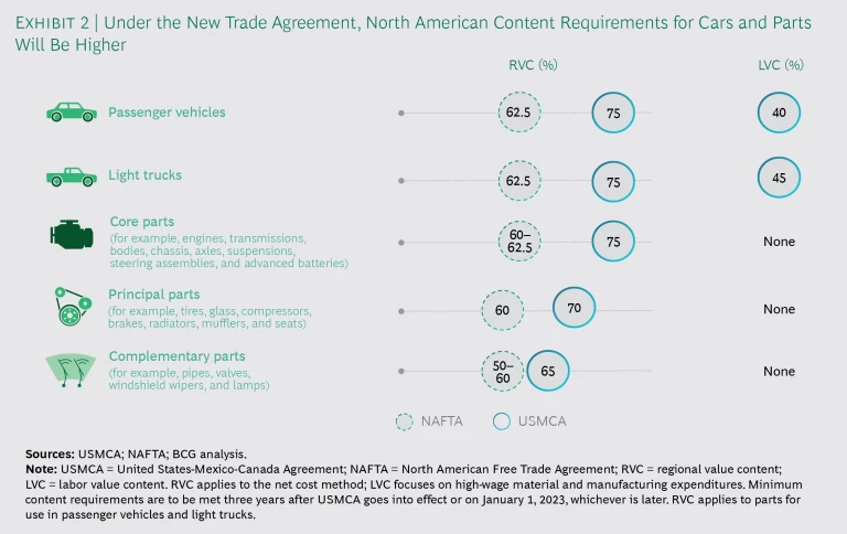 OEMs and parts suppliers will face new regional value content (RVC) rules stating that only passenger vehicles and light trucks with at least 75% of the value produced in any of the three countries will be allowed to move duty free within the USMCA zone. In addition to the vehicle-level RVC, there will be specific RVC requirements for different parts categories. For example, the RVC requirement for so-called core parts such as engines is 75%. (See Exhibit 2.)