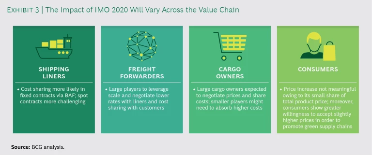 Shipping liners bear direct responsibility for compliance with IMO 2020 and are rapidly preparing for the technical and operational aspects of compliance. From a commercial perspective, though, many liners need to do more to prepare for sharing the cost of compliance with their customers. The entire ecosystem of value chain participants—including freight forwarders, cargo owners, and consumers—should be willing to bear their fair share of the costs. Indeed, leading companies across industries recognize that investments in sustainability generate returns for their business as well as society.