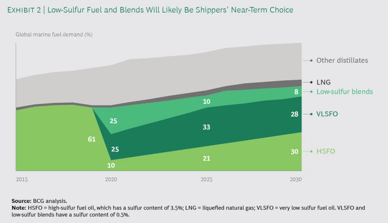 To comply with IMO 2020, liners must adopt one of three possible solutions: installing scrubbers, using liquefied natural gas (LNG), or switching to VLSFO. Retrofitting a vessel with a scrubber requires an investment of $3 million to $5 million. To use LNG, operators need to install new engines or convert existing ones—we estimate that the additional capex would reach $25 million to $30 million for a large container ship. In contrast, substituting VLSFO for HSFO requires only minimal capex investments. As a result, in the near term, fleet operators will likely choose VLSFO. Our analysis finds that VLSFO and other low-sulfur marine gasoil blends will account for approximately 50% of global bunker demand in 2020, after IMO 2020 goes into effect. But their market share will decrease to approximately 36% by 2030, following a ramp-up of scrubber installations and LNG-powered vessels. (See Exhibit 2.)
