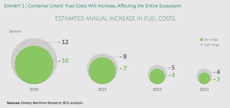 The cost of complying with IMO 2020 will be significant. As noted, BCG’s analysis finds that the cumulative additional fuel costs for container liners could amount to nearly $30 billion through 2023. (See Exhibit 1.) The annual increase will be highest in 2020, when it will reach an estimated $10 billion to $12 billion. Subsequent years will see smaller annual increases owing to a shrinking price differential between high-sulfur fuel oil (HSFO) and the more expensive very low sulfur fuel oil (VLSFO), which has 0.5% sulfur content. Also, some liners will need to make capex investments to install scrubbers (technology that removes sulfur emissions from ship exhaust), and all will incur additional operating expenses (including for inspections).