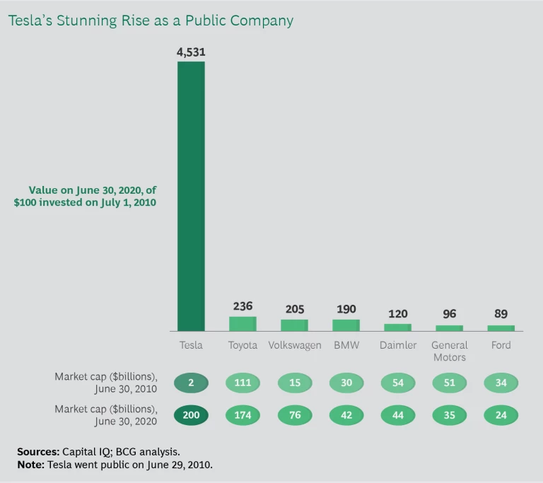 In short, Tesla is many people’s idea of what the car of the future should be. This has helped the company pick up market share and grow at a faster rate than the broader automobile industry. Even though it sells only one car for every ten sold by the biggest auto-makers, it has the highest market capitalization of any automaker. This past June—a decade after its initial public offering—Tesla’s value jumped past Toyota’s. (See the exhibit.)