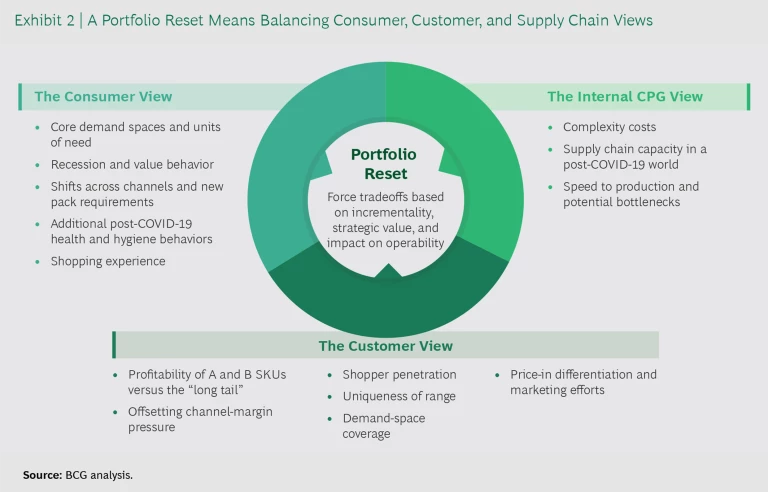 CPG businesses can respond to the constraints imposed by the crisis, first and foremost, by resetting their portfolios for the new reality. To do so, they should move quickly to integrate internal, customer, and consumer intelligence—not only to identify new white spaces but to make smart portfolio tradeoffs and choose their targets with care. Balancing these three perspectives will be imperative to success (see Exhibit 2).