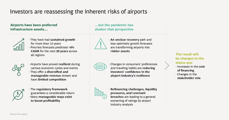 The pandemic is changing the future for airports. In the first ten months of 2020 alone, it wiped out more than $100 billion in combined airport revenues globally and cut airport traffic by 60%. And although airports have traditionally been viewed as safe, profitable assets, investors are rethinking that perspective as uncertainty clouds their future. In the short term, airports face travel restrictions, airline bankruptcies, and low foot traffic. Longer term, a potentially permanent reduction in business travel and an increasing preference for sustainable air travel pose challenges.