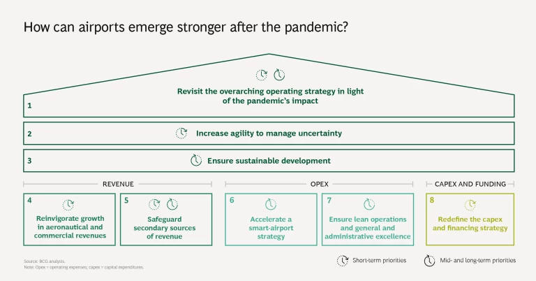 But proactive airports can emerge from the pandemic stronger. The following slideshow lays out an eight-point strategy for facing the ongoing uncertainty and potential headwinds, identifying and pursuing opportunities, and building a stronger future.
