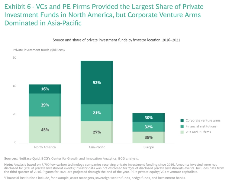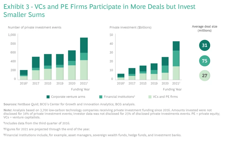 To get the job done, according to the IEA, as much as $21 trillion in new investment in both mature and newer low-carbon technologies will be needed over the next ten years. And of that $21 trillion, fully 10%—a minimum of $2.1 trillion—will likely have to come from private investors, including venture capitalists (VCs), private equity (PE) firms, corporate venture arms (CVAs), and financial institutions.