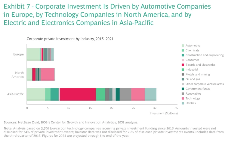 Technology companies dominate among corporate players, making up half the total, and the vast majority of their investments in low-carbon technologies are in EVs. (See Exhibit 7.) Automotive players make up a much smaller share of the total in North America compared with their European and Asian counterparts; they also focus on EVs and energy storage. Investments by the CVAs of oil and gas and electric and electronics companies account for much less in North America as a share of the total when compared with the other regions.