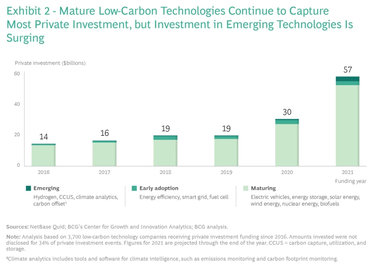 Now the good news. Private investment in low-carbon technologies has almost doubled since 2020, to a projected $57 billion. Moreover, the proportion of investment dollars devoted to early-adoption and emerging technologies has grown from just 1% in 2016 to a projected 6% of the total in 2021. (See Exhibit 2.)