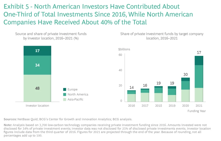 Private investment in low-carbon technologies has not been spread evenly around the world. Since 2016, investors from the Asia-Pacific region contributed almost half the total, with investors in North America contributing about a third and European investors adding less than a fifth. North American and European companies have rapidly increased their share of investments received, however. In just the past year alone, they attracted 2.7 times the amount they received in 2020, with North American companies capturing fully half of the total. Meanwhile, investment in Asia-Pacific companies remained essentially flat. (See Exhibit 5.)
