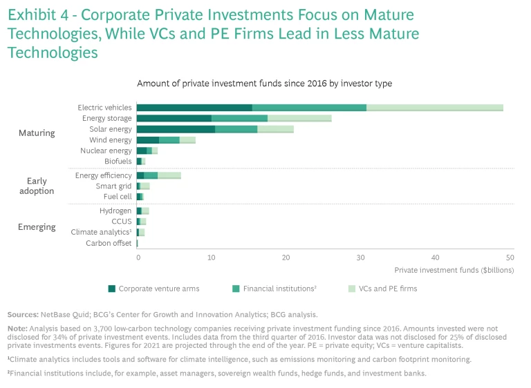 During the past year, however, the total financial commitment from VCs and PE firms has almost doubled, as have investments from financial institutions, while investments from CVAs remained essentially flat. (See Exhibit 3.) The jump in investment from VCs and PE firms is understandable, given their desire to participate in the ongoing development of promising new technologies. And many financial investors have increasingly turned to less mature companies that are developing new low-carbon technologies both as a way to boost investment returns and as part of their sustainability aspirations.